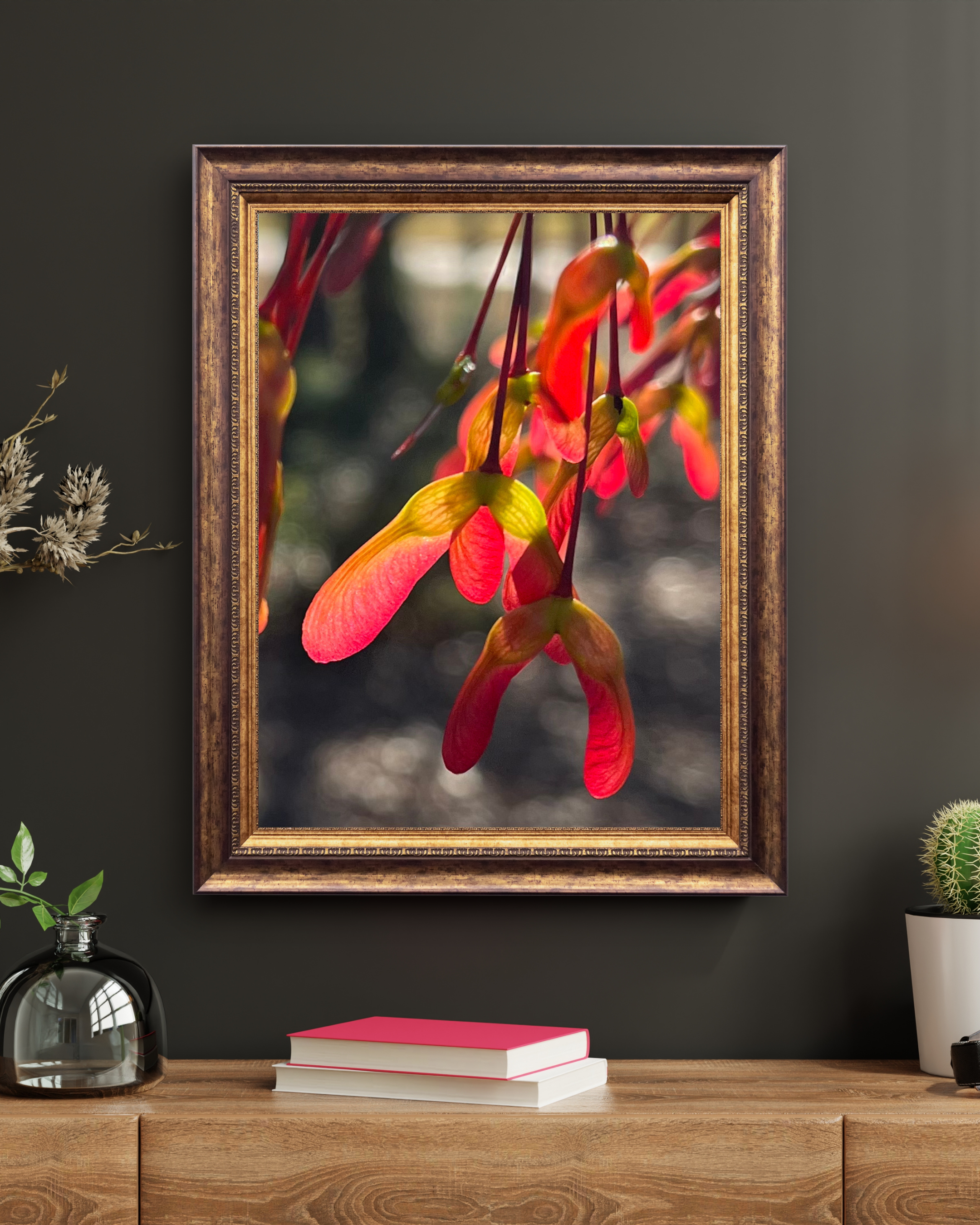 Capture the charm of nature with this striking photograph showcasing vibrant red oak seeds bathed in golden sunlight. The warm light brings out rich amber and crimson tones, highlighting the intricate textures and organic forms of these botanical curiosities.