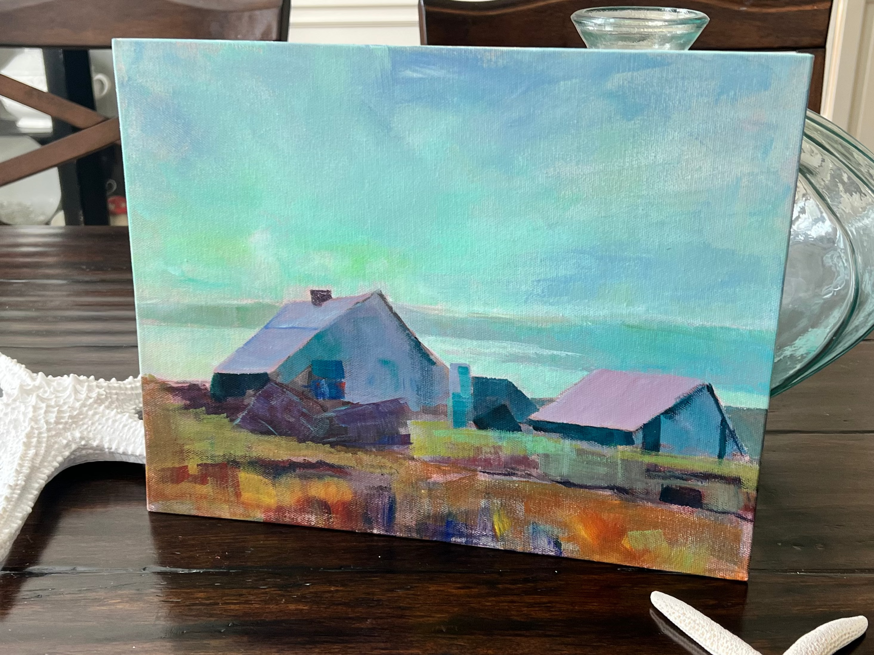 This oil painting on board captures serene barns in soft pastel hues set against the calm light of twilight. The subtle blending of blue and turquoise tones brings a tranquil, ethereal quality to the rural scene, highlighting the quiet beauty of the countryside at dusk.